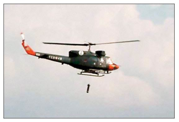 Гидролокатор большого радиуса действия AN/AQS-13F обнаруживает и поддерживает контакт с подводными целями с помощью трансдьюсера, опущенного в воду с зависшего вертолета.